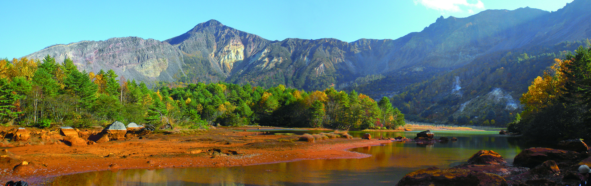 銅沼と爆裂火口壁(崩壊壁)(北塩原村)