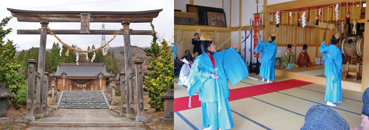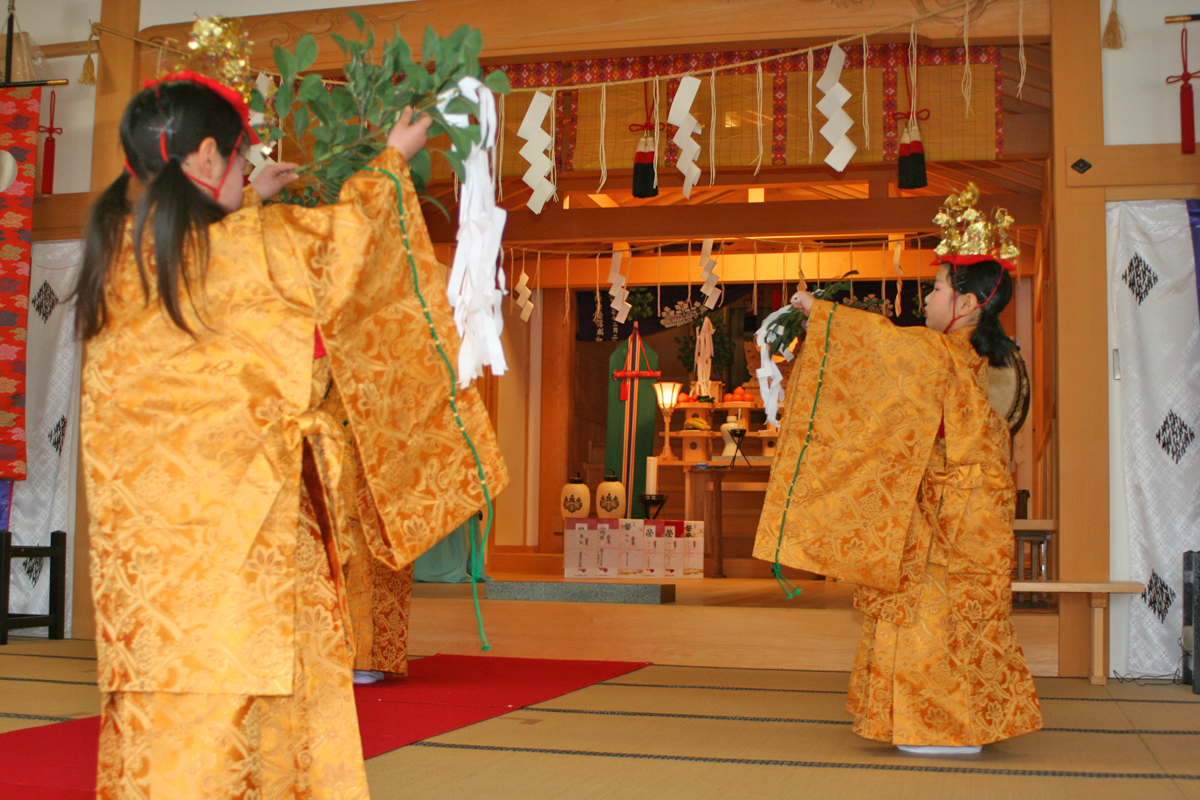 また、祭礼の冒頭には磐梯明神を迎えるため、神前で地元地区の女児が舞手となって「巫女舞」が奉納される。この巫女舞も同様にかつては恵日寺の年中行事であった「児之舞」(このまい)を起源とするとみられ、同じく廃寺後磐梯神社に継承されたものである。明治期に一時途絶えたが、約80年の時を経て昭和45年に復活した。現在は榊・弓・太刀を依代(よりしろ)とした三座が伝承されているが、以前はそのほかの舞もあったという。これら神社祭礼にまつわる一連の神事は平成17年に「磐梯神社の舟引き祭りと巫女舞」として県の重要無形民俗文化財に指定された。