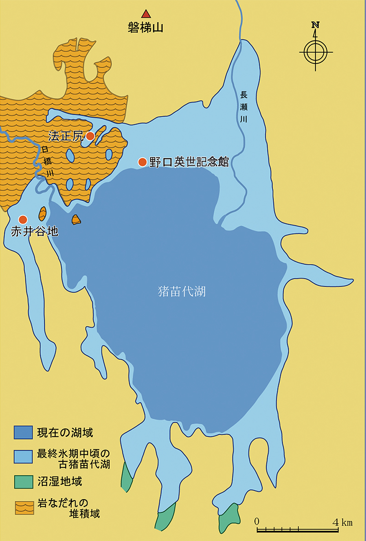 3~5万年前に起こった磐梯山噴火により生じた「翁島岩なだれ」により、当時猪苗代盆地から会津盆地に流れていた川がせき止められ、現在みる広大な猪苗代湖が誕生したと考えられている。さらに法正尻のボーリング試料などから、約3万年前には、猪苗代湖の水面は現在よりも15~20m高かったことが分かっている。