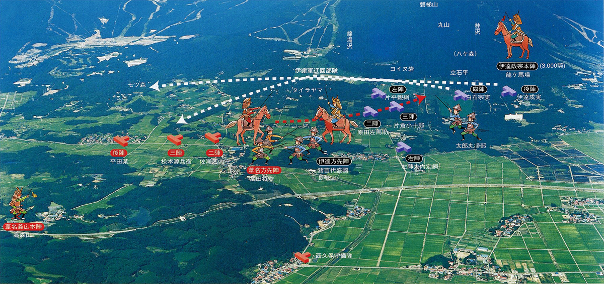 摺上原古戦場空撮戦国時代末期の1589(天正17)年6月5日早朝、会津城主葦名(あしな)義広軍16,000騎と米沢城主伊達政宗軍23,000騎とが、磐梯山麓の摺上原(すりあげはら)で激突、東北の雄を決める戦いが行われた。当初、葦名軍の先陣・富田将監が、伊達軍の先陣・猪苗代盛国勢を破り、伊達軍の二陣原田勢、さらに三陣片倉勢を突き崩して政宗の本陣を目指した。この時、伊達軍の太郎丸掃部(かもん)が200人の足軽を指揮して将監勢に鉄砲を浴びせかけ、将監方に多くの犠牲者が出たが、将監はついに太郎丸を討ち取りなおも進撃を続けた。しかし、葦名軍の二陣佐瀬勢、三陣松本勢、五陣平田勢などは兵を進めなかったばかりか、戦見物の雑人たちが伊達軍に撃ち崩されたのを見て、味方の葦名軍が敗れたと思い、一度にどっと崩れて若松に向って退却を開始した。浮足立った葦名軍は日橋川まで後退したところ、あらかじめ伊達軍が廻り込んで橋を壊しておいたので、葦名軍は橋がないことに慌てふためき多数の兵が川に落ちて溺れ死んだ。これを機に葦名軍は総崩れとなり、葦名義広はわずか30騎ばかりとなった近習に守られ、黒川城に逃れた。摺上原の戦いに勝った政宗は、それから6日後に葦名家の居城・黒川城に入り、会津の領地を手に入れ、400年続いた名家葦名家は滅びた。しかし、政宗が会津に入ってからわずか1ヶ年過ぎた1590(天正18)年7月10日、豊臣秀吉の奥州仕置(※1)によって、政宗は会津を追われた。