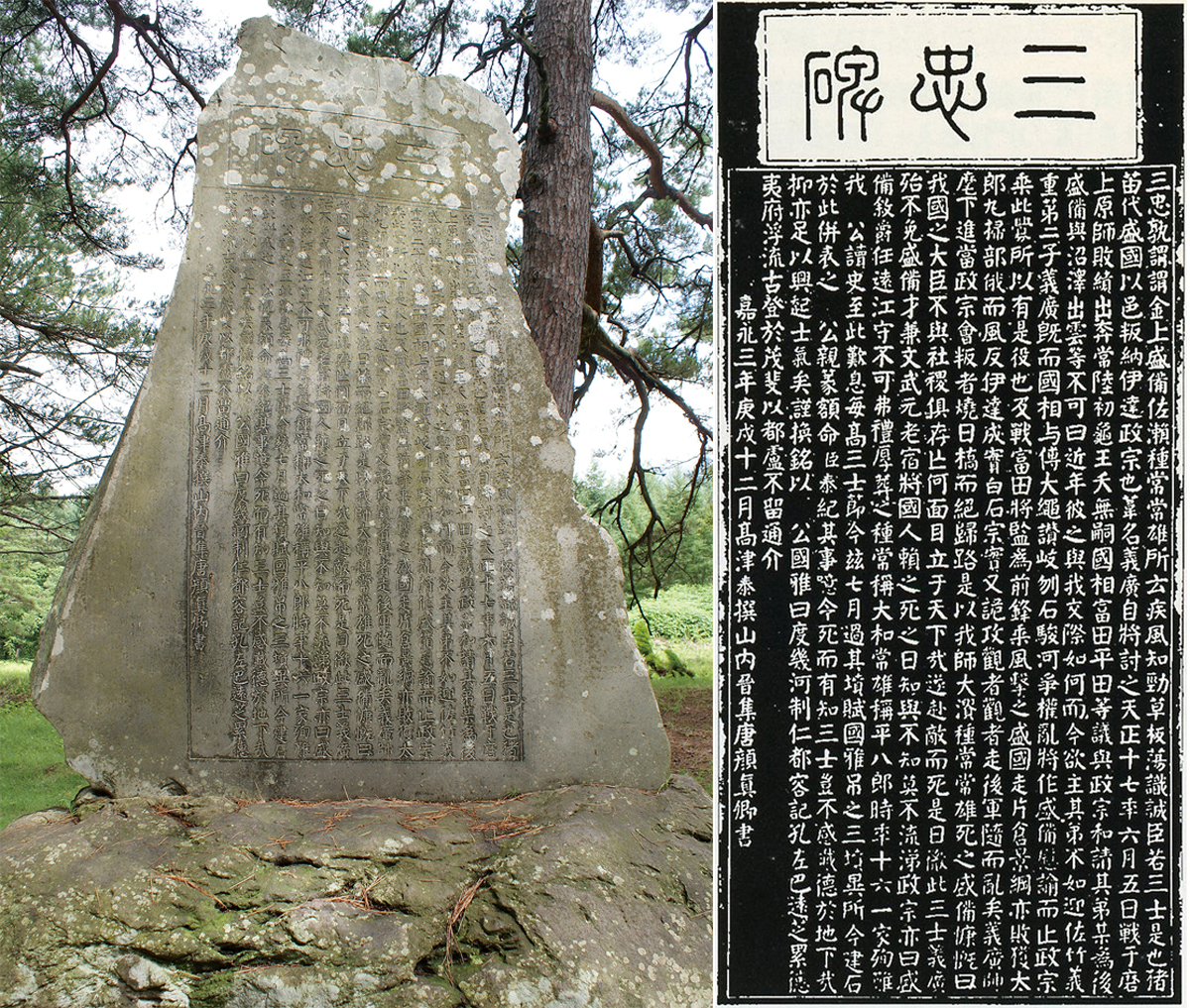 摺上原(すりあげはら)の戦いで敗走する葦名勢の中で、葦名の家臣・佐瀬常雄は踏みとどまって奮戦したが痛手を負い、ついには討死した。その養父・佐瀬種常も、同じく伊達勢と戦い討死、少し遅れて津川から駆け付けた金上盛備(もりはる)も伊達勢に攻め込んで討ち死にした。主君のために忠誠を尽くした三人の武士を後世に伝えるため、会津8代藩主・松平容敬(かたたか)は藩の儒学者・高津泰(たい)に命じて撰文(せんぶん)、437文字全文を唐の名筆家で熱血忠義の人物である願真卿(がんしんけい)の書体を集め刻み1850(嘉永3)年建立した。