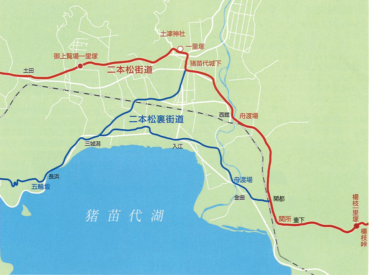 この二本松街道の南側を通る二本松裏街道もあった。これは、関都から西側へ向かい金曲を通り、長瀬川を渡り、猪苗代湖の北岸沿いに、入江・三城潟・長浜から戸ノ口・強清水を通り、沓掛峠を越え、滝沢峠を越えて滝えん沢町の蚕養国神社への道で上街道とも呼ばれた。この二本松裏街道のほうが、現在の国道49号線に沿う通りで、現在も使われている。 この二つの街道を結ぶのが、三城潟から猪苗代城下まで通る街道であった。