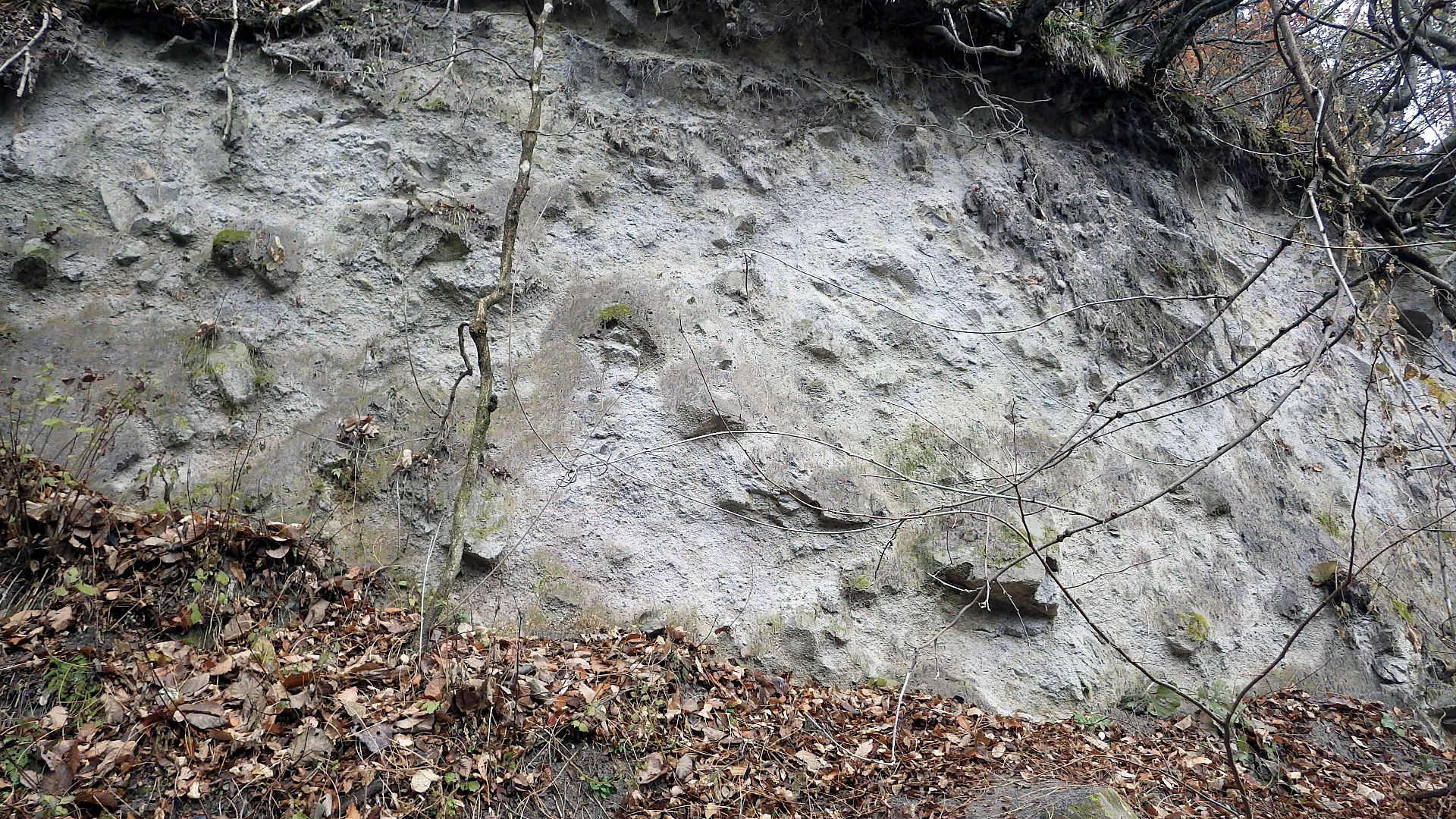 トンネルの少し東側には、二の沢層上部の灰白色のデイサイトの露頭がある。象の鼻は、このデイサイトをくりぬいたものである。