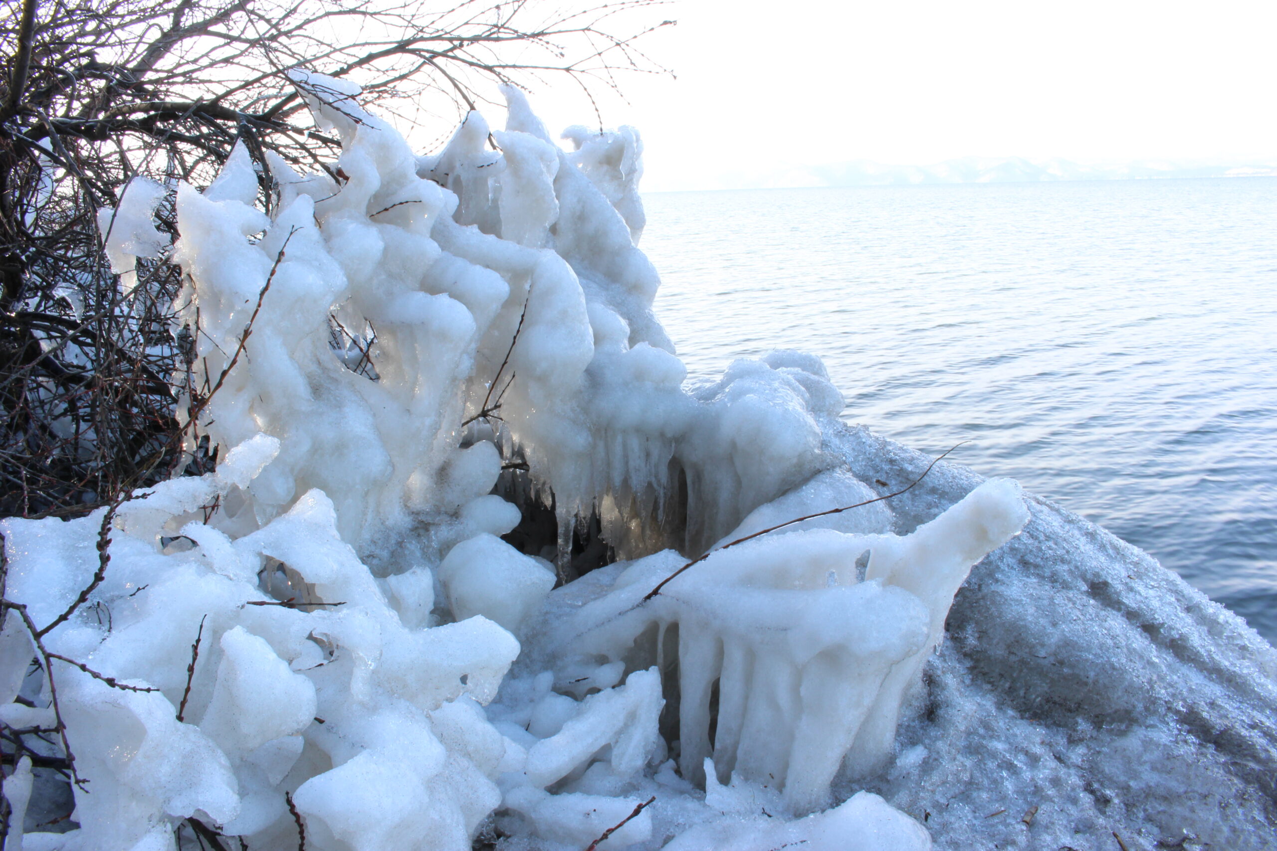 天神浜の町営駐車場から歩くこと約20分…湖岸に到着です!しぶき氷!小さいですができていました(*^-^*)やわらかい陽の光に氷がつやつやと輝いてとてもきれいでした。