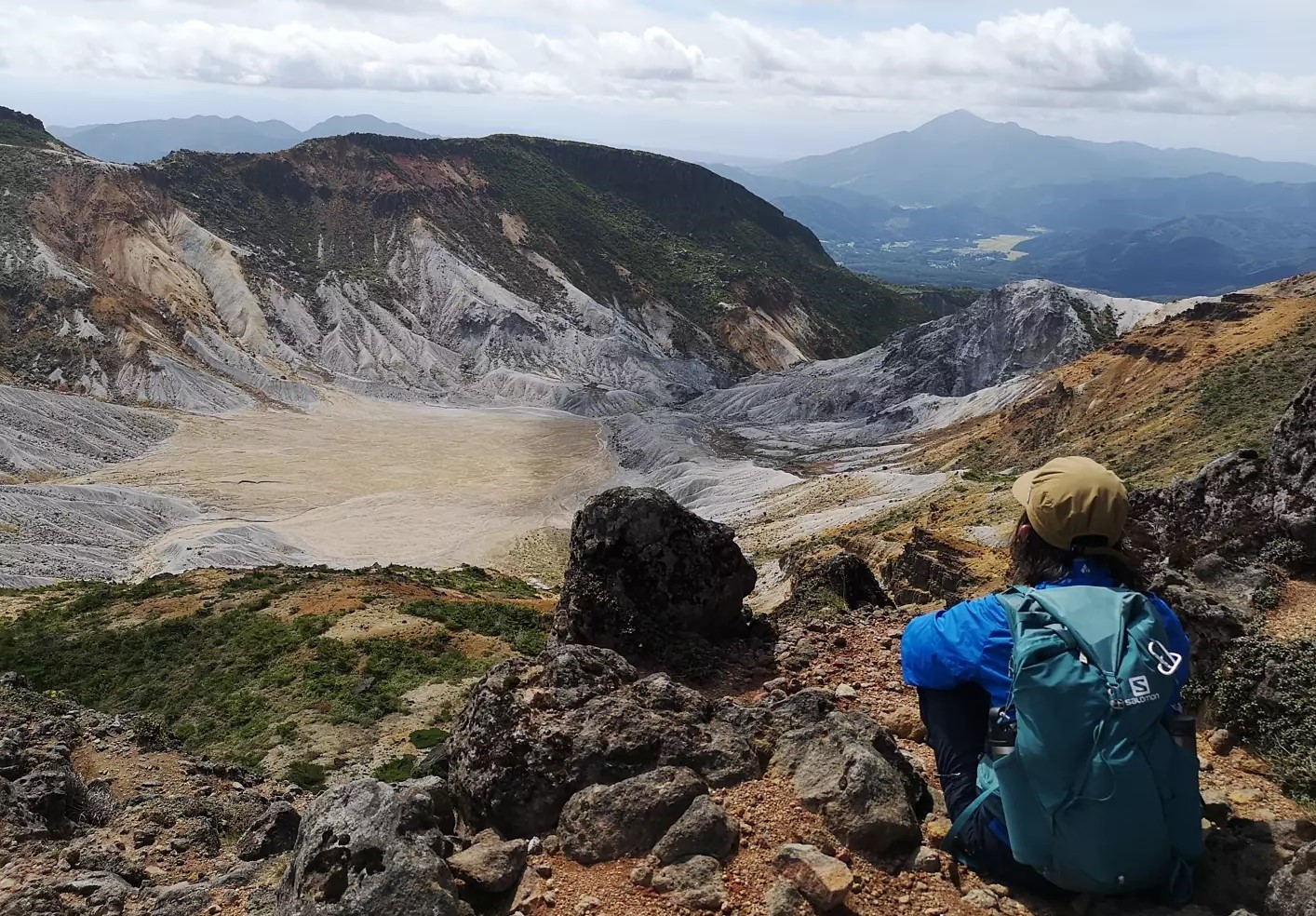 写真:鉄山から見下ろす沼ノ平(安達太良山の火口)。遠くに見えるのは磐梯山です。