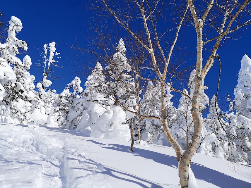 この写真を見ていただければ分かるように、手前に写っているダケカンバは落葉樹であるため、樹氷ができません。葉っぱがないので氷が付きにくいのでしょうね。