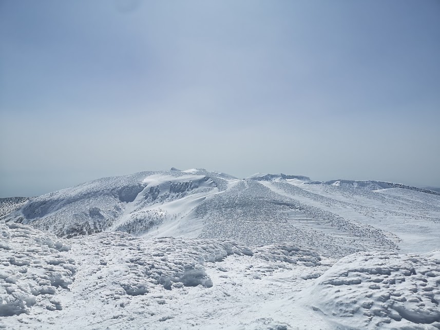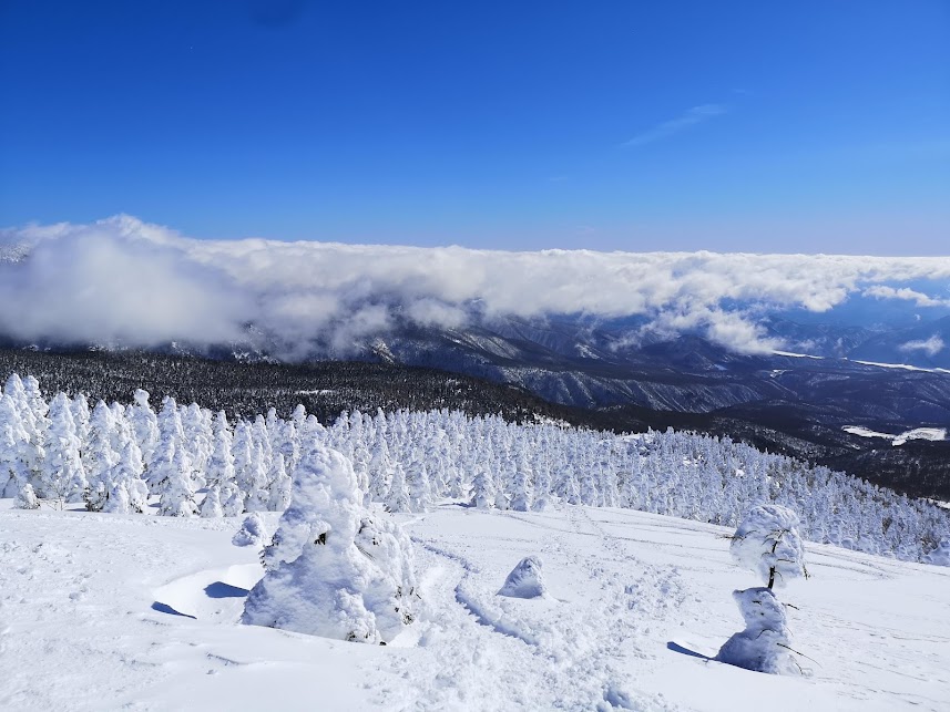 この写真は、西大巓のピーク直前で撮ったものです。目下には立派な樹氷が広がっています。