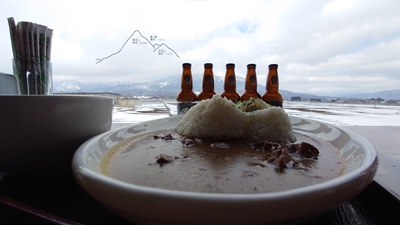 地ビール館から見える磐梯山とライスの磐梯山を合わせるには、カレー側を正面にすると同じ向きになります。
