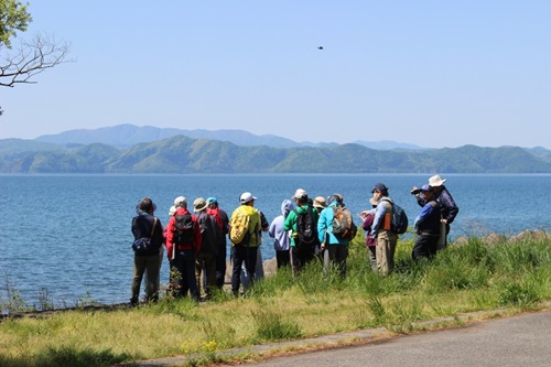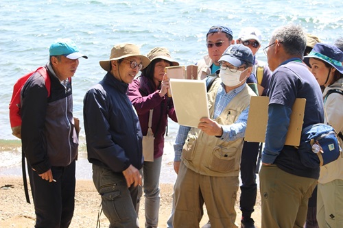 竹谷陽二郎先生からは「猪苗代湖をつくり出した大断層と上戸浜に存在していた上戸カルデラ火山」について、地形や岩石を観察しながら数百万年前の痕跡をたどり、過去から現在への成り立ちを教えていただきました。
