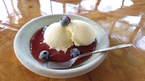 牧場さん自慢のアイスと猪苗代町で採れたブルーベリー、北会津産いちごのジャムがひんやり冷たいお皿の上にのっています。