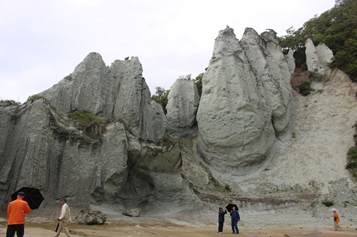 仏ヶ浦の岩は約400万年前におきた水中での噴火でできたとされていて、凝灰岩という岩石の種類だそうです。雨でしっとり濡れた岩の色は濃く、少し緑がかっているように見えました。