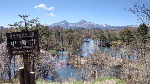 美しい風景だけでなく、中瀬沼展望台は明治の磐梯山噴火によってできた小高い丘(流れ山)で、遠くに見える磐梯山の一部であった山体がここまで崩れて流れてきたことを感じられる地形的にも魅力的な場所です。