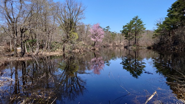 現在の中瀬沼展望台は見通しが良く、青空と山桜のピンク色がよく映えます。