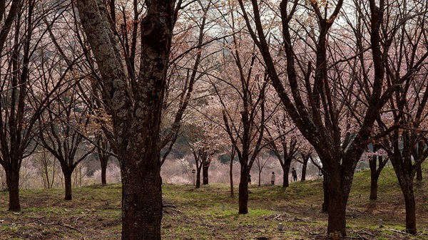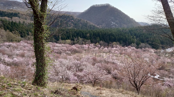 オオヤマザクラが時期を変えて咲くので薄い色、濃い色が淡く混ざり合っていて一面ピンクのじゅうたんのような圧巻の景色をお楽しみいただけます。