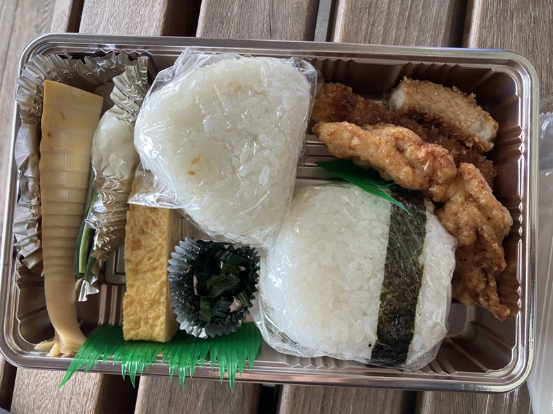 そして皆さんのお楽しみのひとつ、お昼ご飯。今回は地質の日限定ドライブイン磐尚さんの“トンチのつまったおにぎり弁当”!