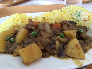 そして磐梯山の特徴である岩なだれを表現するのに大き目のゴロゴロ野菜とひき肉でキーマカレー風のカレーにしています。