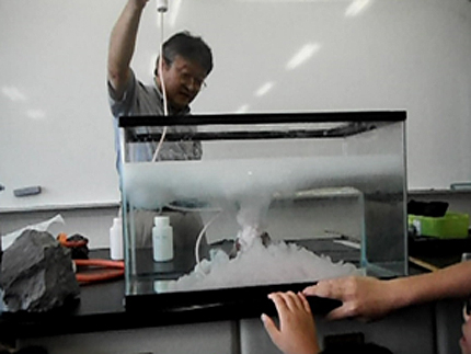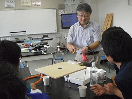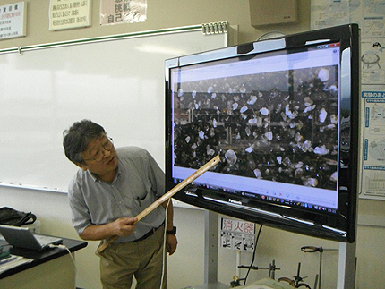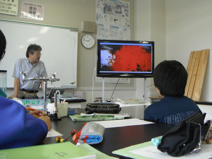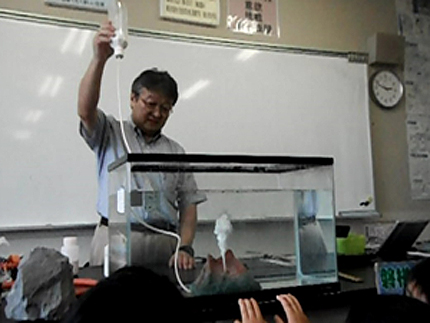 学校の理科室で磐梯山噴火記念館の佐藤公副館長による講座と実験が行われ、生徒たちは火山の映像や実験の状況に引き込まれ、楽しい授業になったようです。