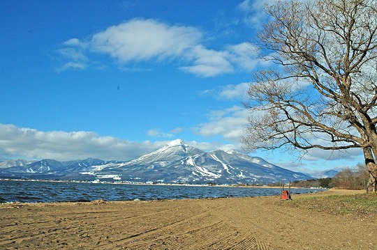 浜の雪は溶けましたが、磐梯山は雪化粧。猪苗代湖(天鏡湖)に姿を映します。