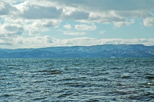 対岸の山には、風力発電の風車が見えます(33基あります。今日は風車が回っていました)