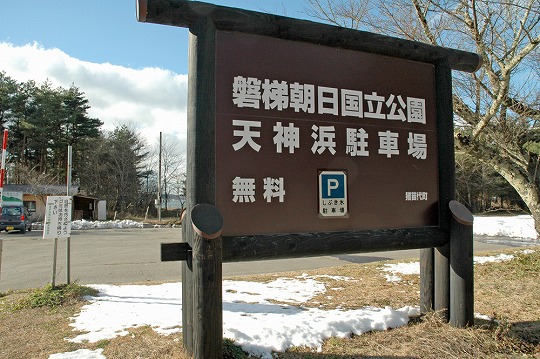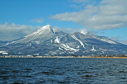 天神浜から眺める磐梯山は、スキー場のゲレンデも良く見えて、こちらは、「スキー(またはスノボ)待ち」しているようです。(裏磐梯の猫魔スキー場などはすでにOPENしました)