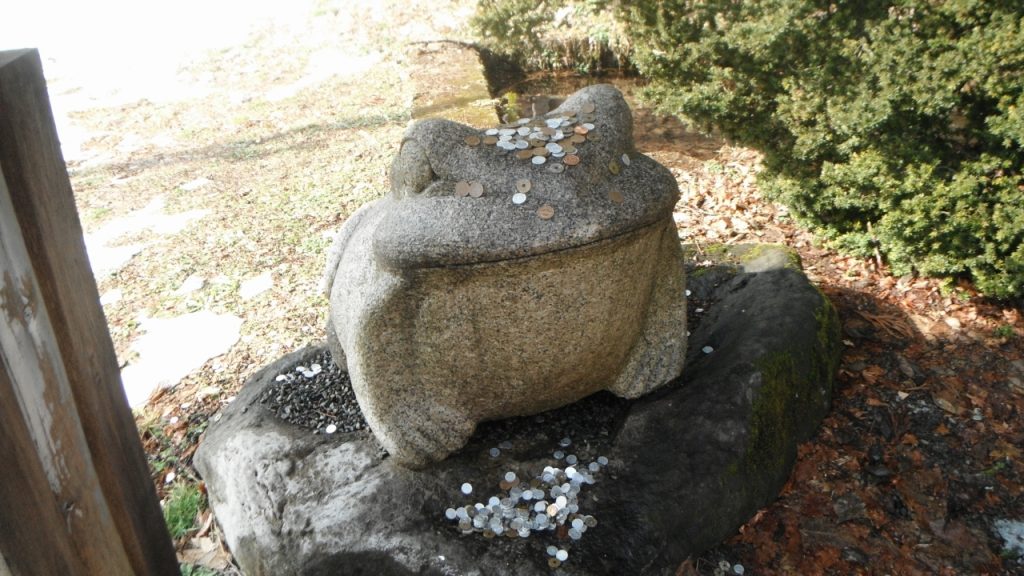 大鳥居そばの「無事かえる」にもお賽銭がのっています。いつもは雪の中なのですが…。