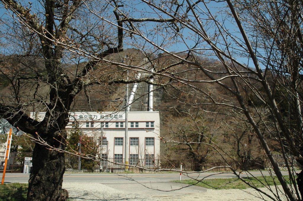 裏磐梯の湖から水を引いている、秋元発電所(ジオサイト34)は、建屋周りを桜の木が取り囲んで道路沿いにも桜並木をつくっています。