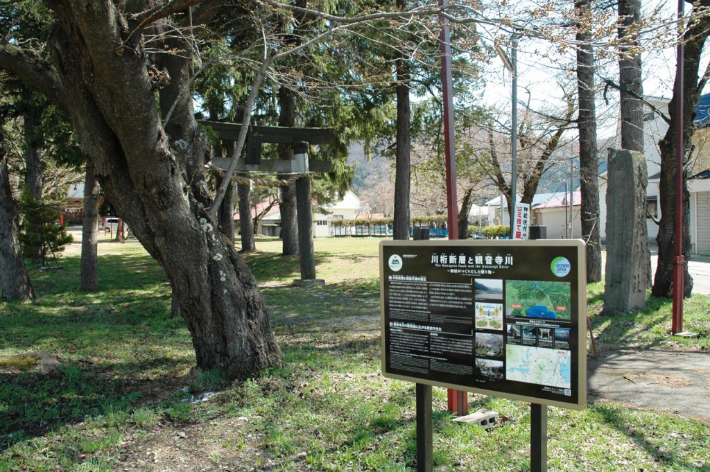 磐梯山ジオパークのジオサイトで桜の見どころとして一番メジャーな観音寺川(ジオサイト71:観音寺沿い)にはジオパークの解説看板を設けてあります。