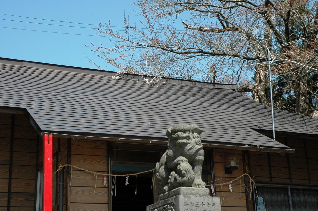 解説看板の立つ観音寺川沿いの大山祇神社の社務所の屋根ではすでに数輪咲いていました。