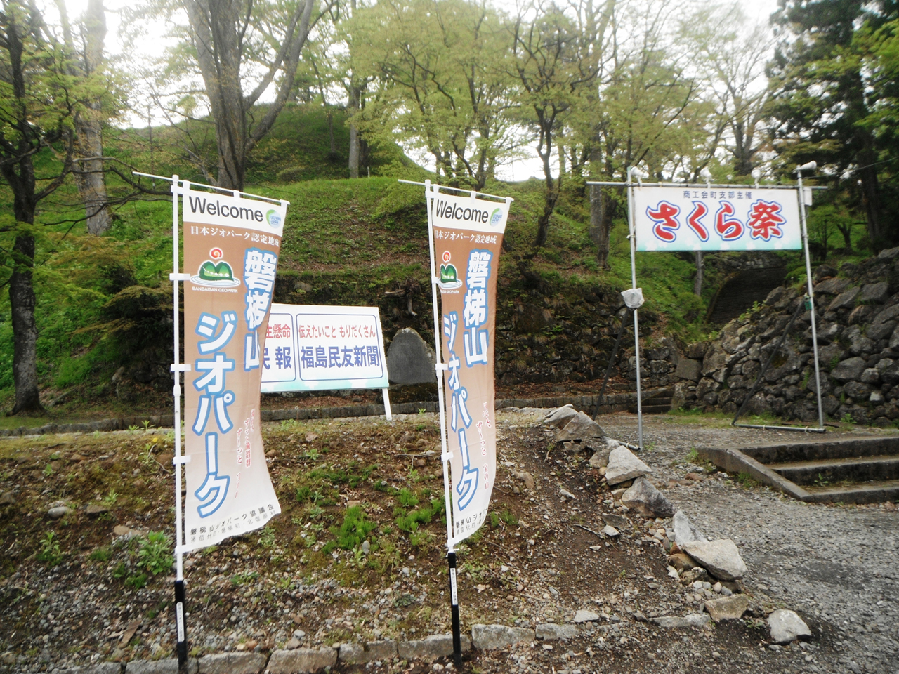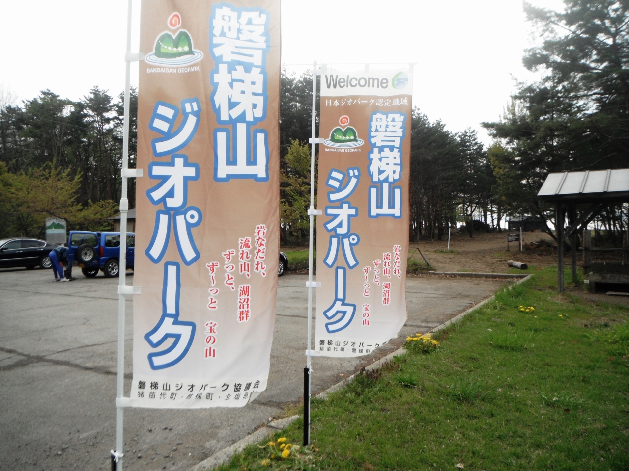 磐梯山ジオパークののぼりを目印にジオサイトにお越しください。お待ちしています。