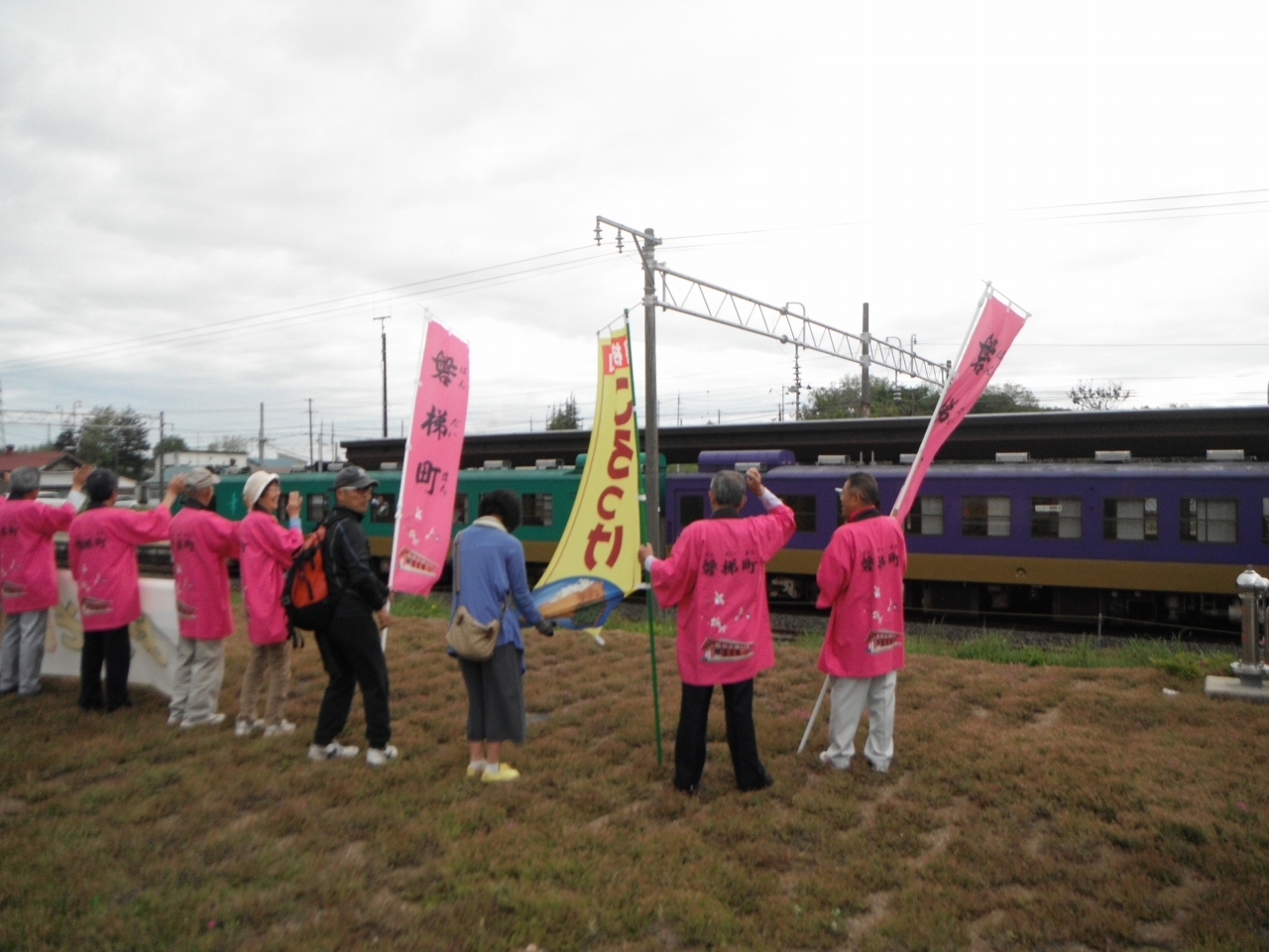 ”磐梯町駅に到着する列車にお迎えの手を振ろう、その際、町民も一緒に楽しんじゃおう”
