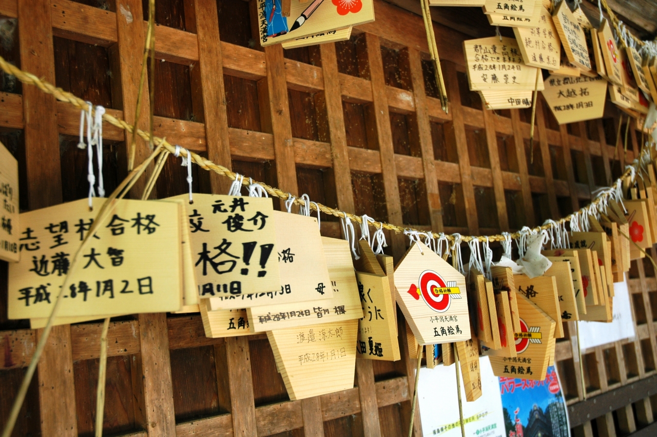 天満宮は学問の神様で、合格祈願の絵馬が拝殿前に掛かっていました。