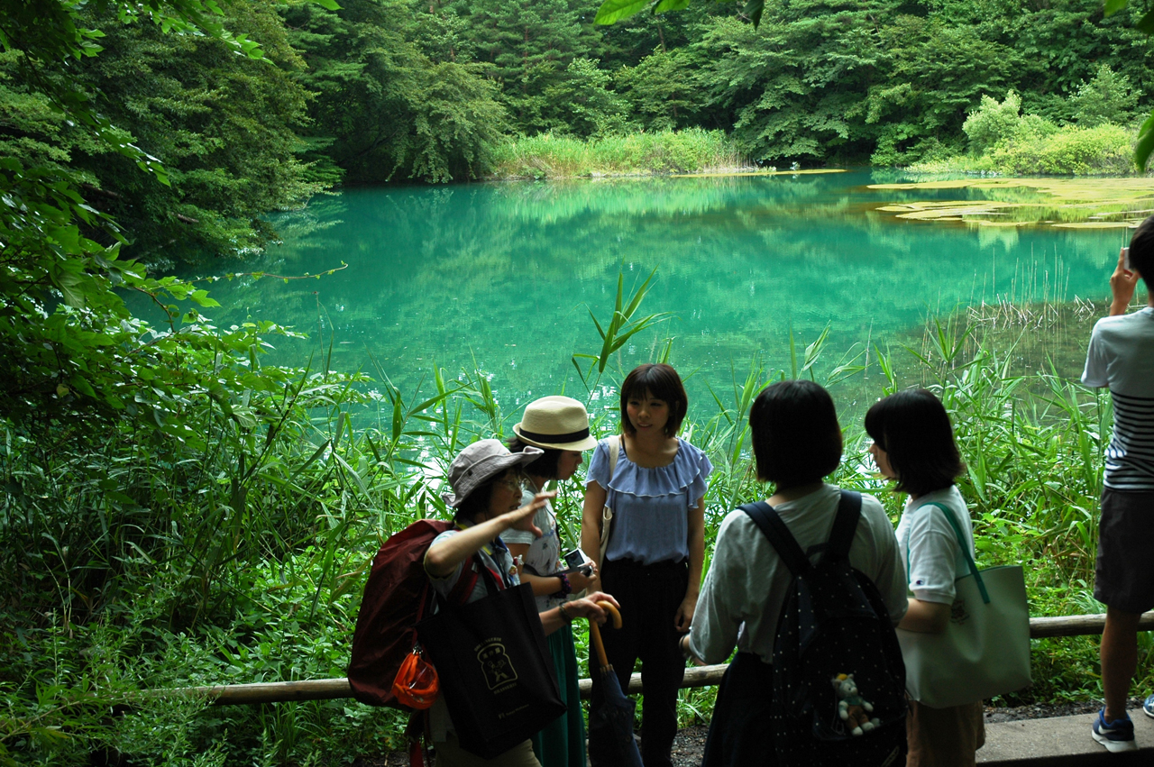 取材中は磐梯山も雲の中に見え隠れする天気ながら、途中薄日も射すと沼の色も鮮やかに見え、雨上りの緑も爽やかに感じられました。
