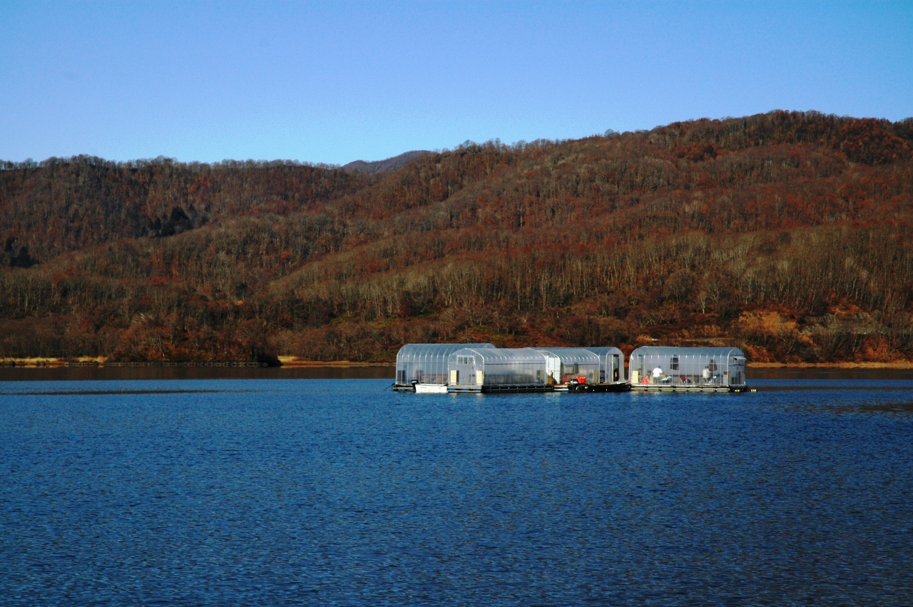 桧原湖が結氷すると始まる、冬の風物詩「氷上ワカサギ釣り」は、もう釣りハウスが水の上で営業中です。
