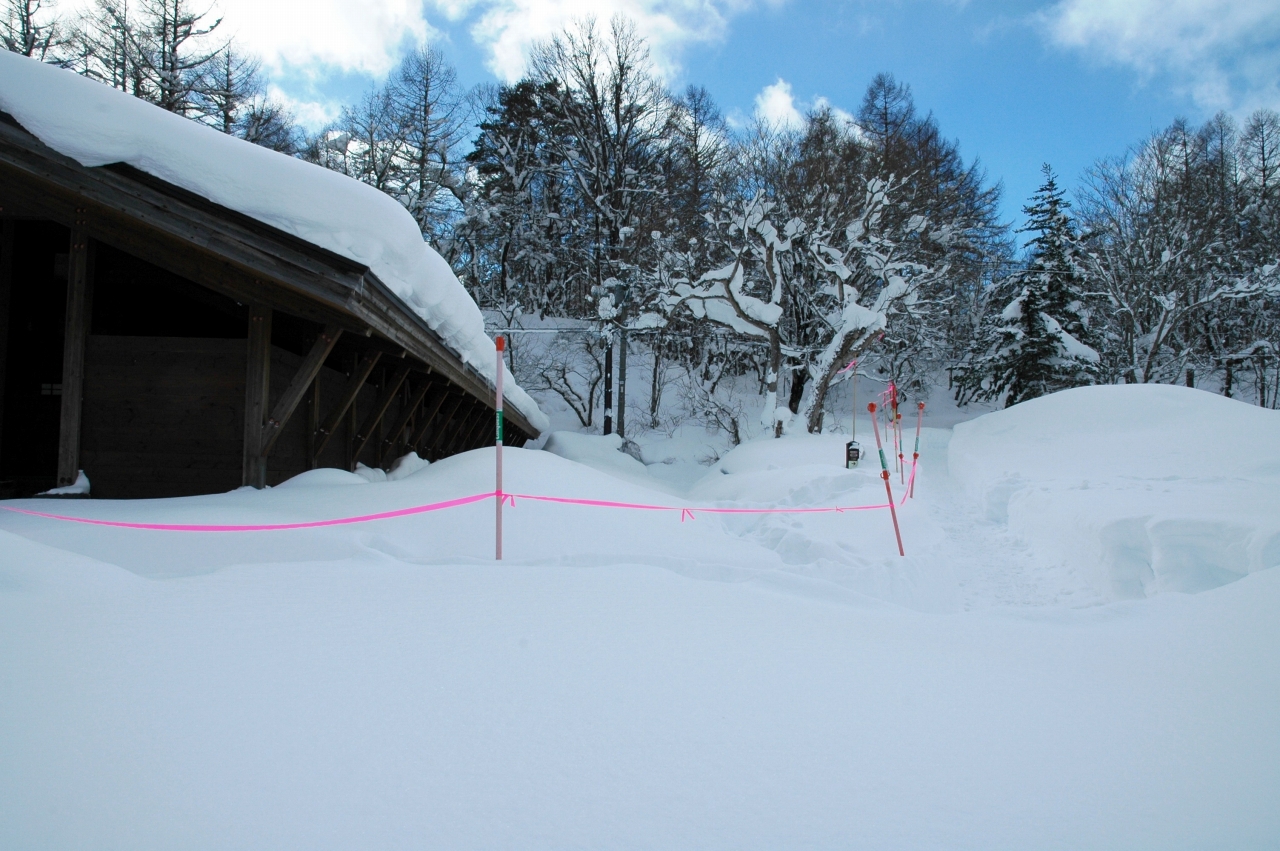 毘沙門沼までの通路を示すピンクのテープも雪の中