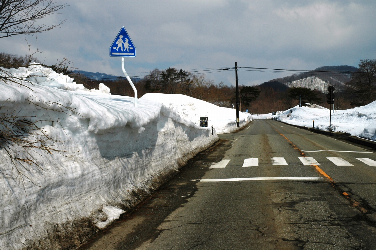 サイトステーション入口。道路脇の雪の壁は、少なくなりました。溶けて地層のようです。