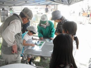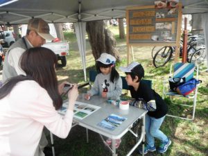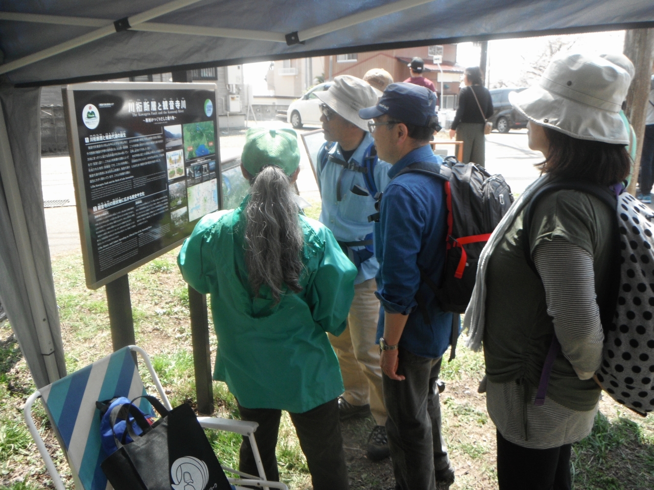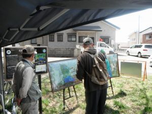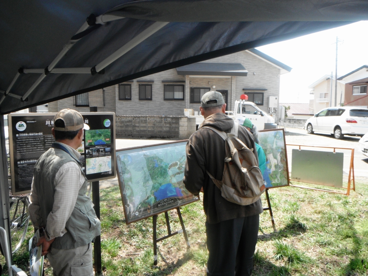 天気も良く気温も初夏なみの絶好のお花見日和の中、観音寺川の解説看板の前で磐梯山ジオパークのご案内ブースを設置しました。