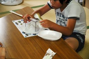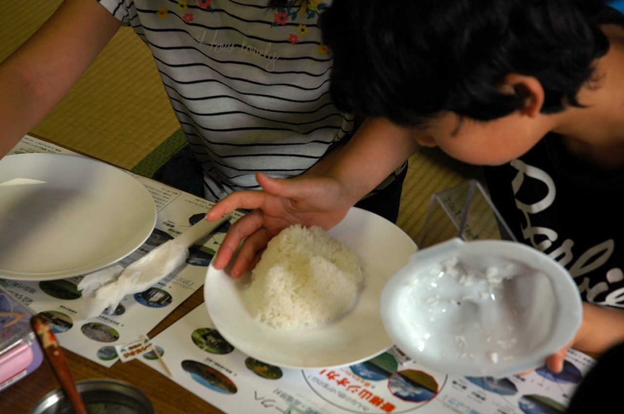 ごはんのうえの小旗もつくり、ご飯型「らいすばんだいさん」(・・・あいづばんだいさんは~♪と歌いたくなりますよねー)でご飯を盛り付け。カレーは好みで甘口・中辛を選んで、自分だけの「磐梯山ジオカレー」ができました。