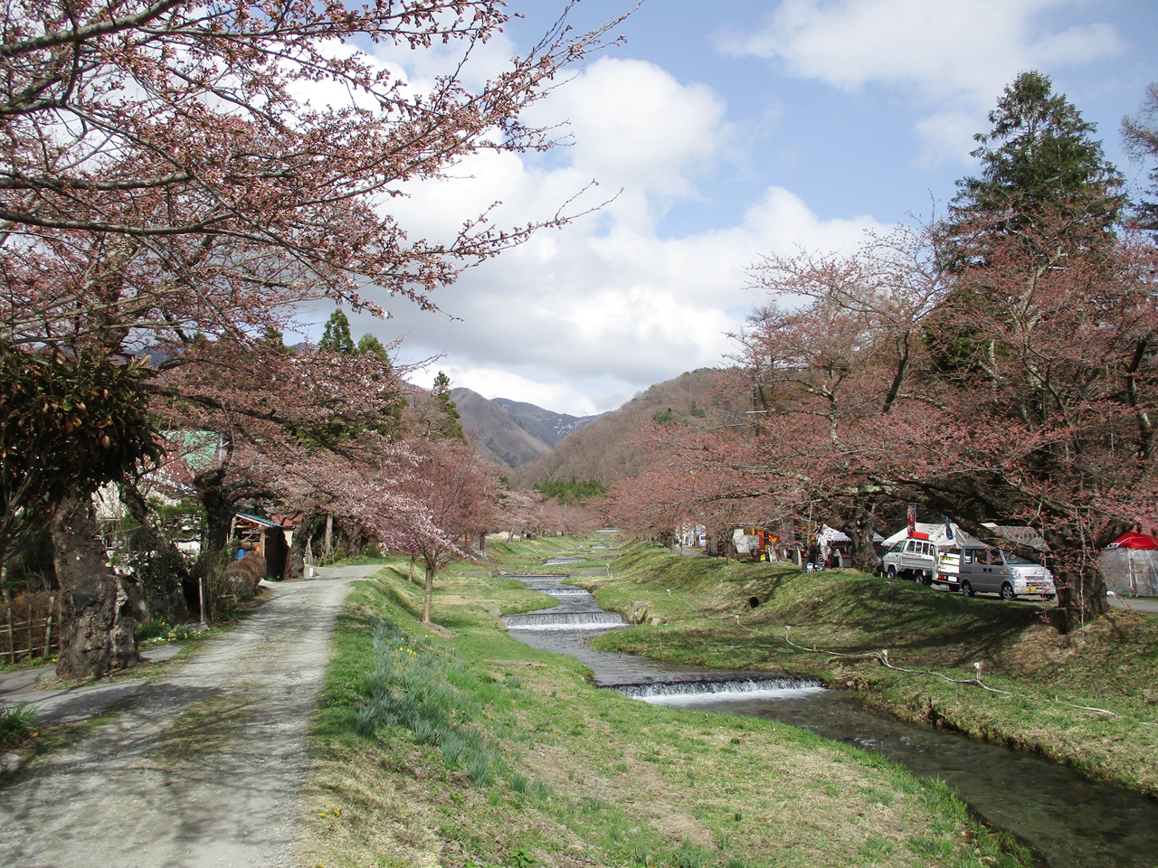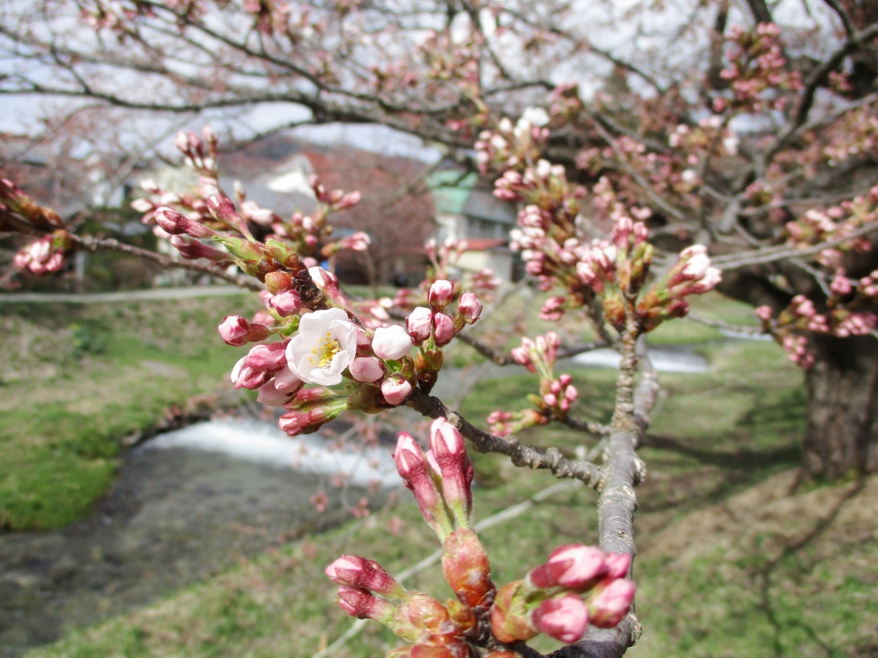磐梯山ジオパークジオサイト、観音寺川の桜が咲きはじめました。