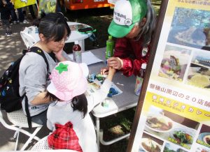 花見と一緒に磐梯山ジオパークの案内看板のもと、「サイコロパズル」で楽しんでいただきました。