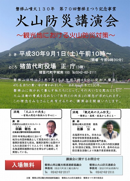 磐梯町・北塩原村・猪苗代町の3町村で組織する「磐梯山周辺観光推進連絡協議会」「磐梯山火山防災連絡会」並びに「磐梯まつり実行委員会」の事業、火山防災講演会「観光地における火山防災対策」が開催されます。