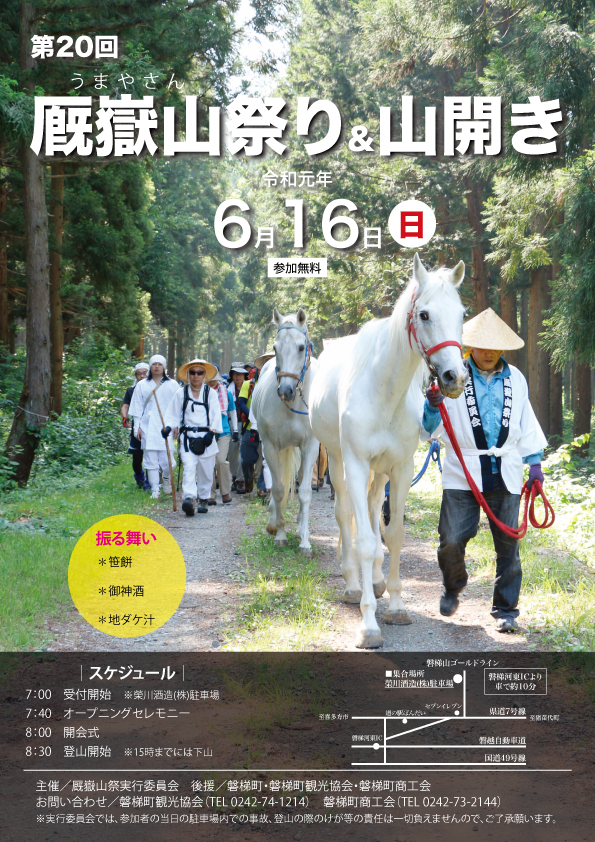 厩嶽山祭りは、1300年もの歴史があると伝わる会津地方の馬頭観音信仰の中心地「厩嶽山」において、農耕馬の無病息災、供養、安全守護のため馬と一緒に参拝したとされる伝統ある祭りです。