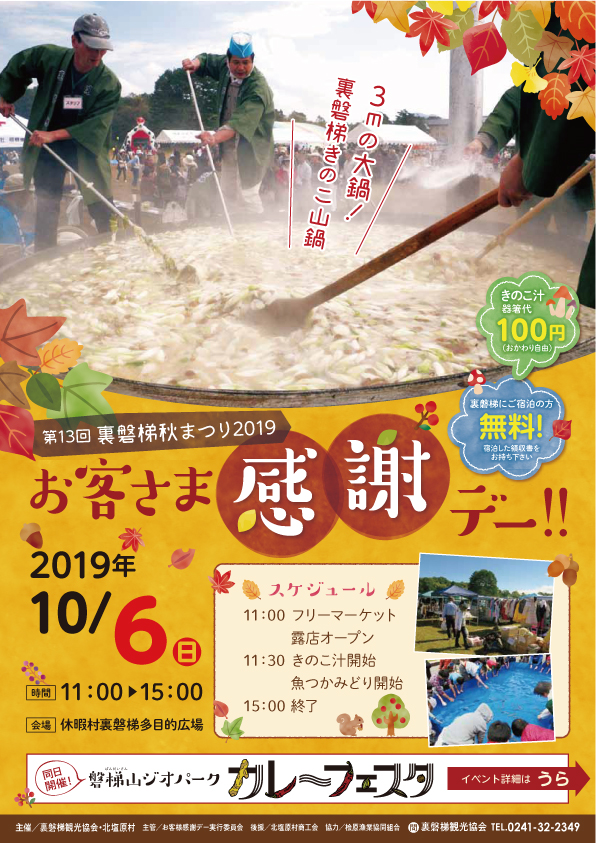 今年の【磐梯山ジオパーク カレーフェスタ】は、裏磐梯観光協会・北塩原村主催の第13回裏磐梯秋まつり2019「お客様感謝デー」と同時開催!