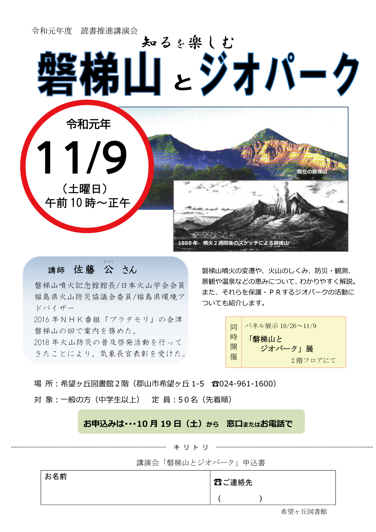 【終了】読書推進講演会 知るを楽しむ「磐梯山とジオパーク」【11月9日(土)開催】