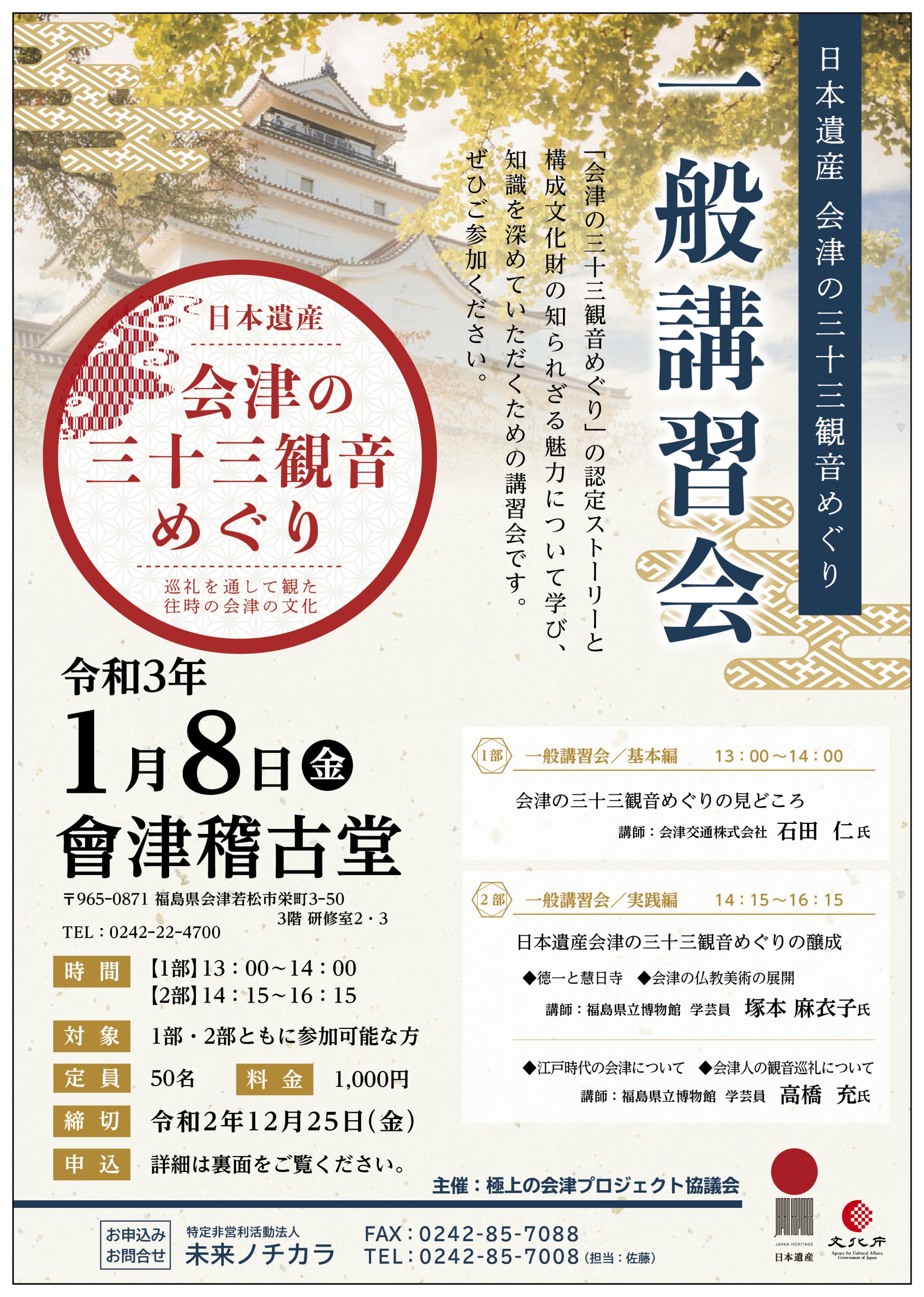 | 内容 | 【第1部】13:00~14:00 基礎編「会津の三十三観音めぐりの見どころ」 講師:会津交通株式会社 石田 仁 氏 【第2部】14:15~16:15 |
