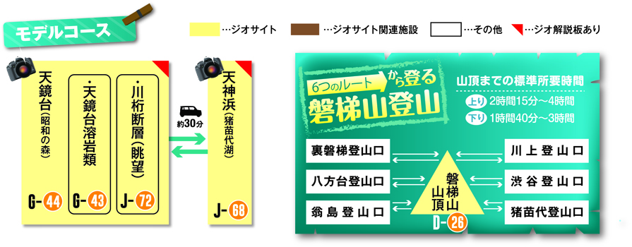 磐梯火山と猫魔火山、そして日本第4位の大きさを誇る猪苗代湖、さらにその東西に立ちはだかる川桁山地と背炙山地といった、磐梯山を取り囲む雄大な風景から大地創造のストーリーを大パノラマで理解しましょう。さらに、磐梯山を登山することで一層の大パノラマを探れます。